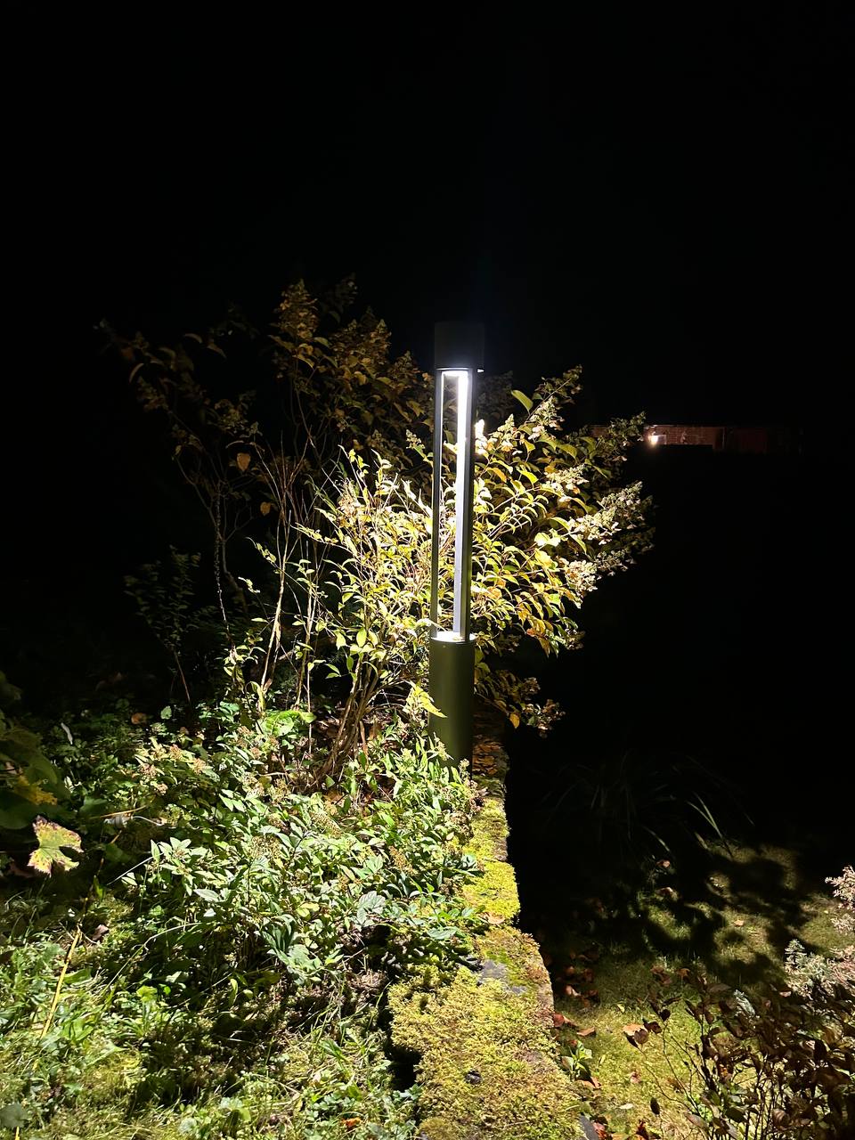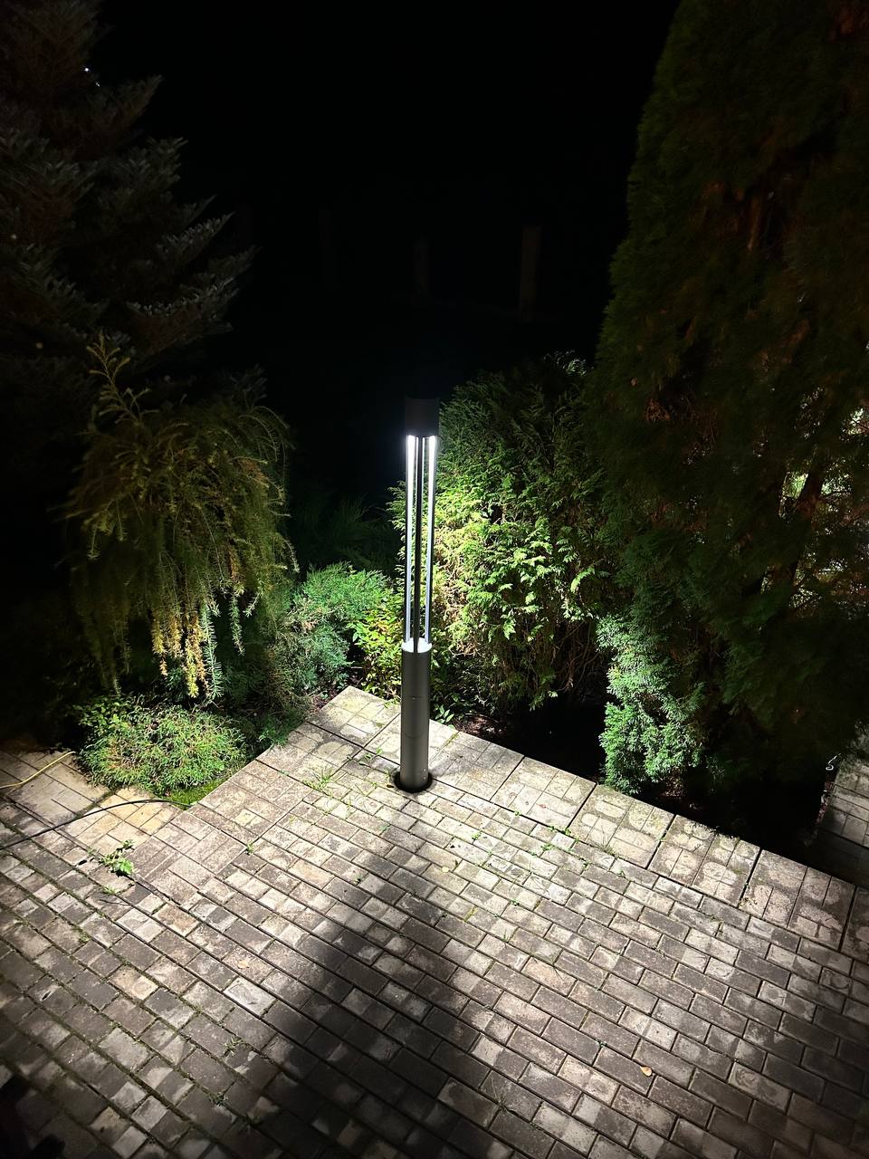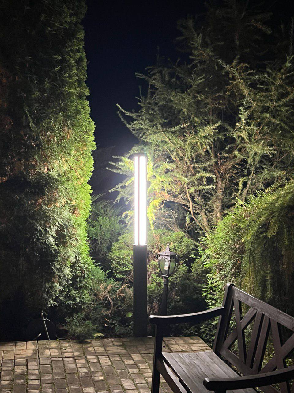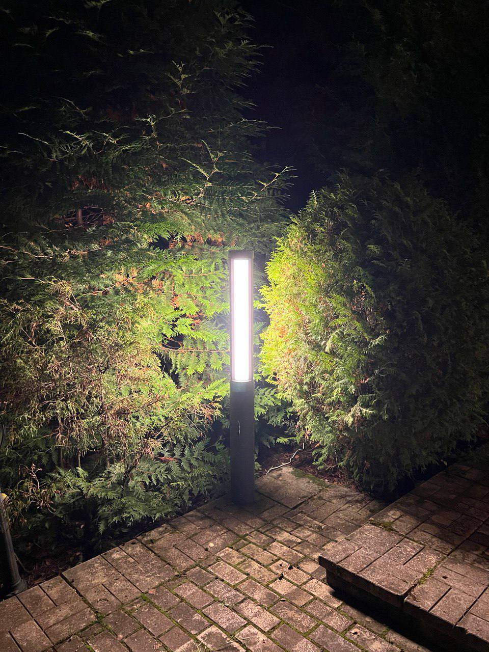 Светодиоды расположены в верхней части светильника и дают очень хорошую освещенность нижней части и вокруг столба.