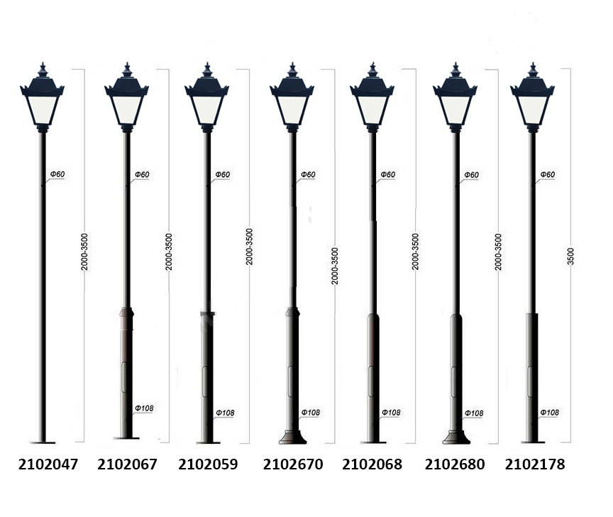 Серия 2102 предназначена для эффективного освещения городских улиц, парков, аллей. Комплектуется патроном Е27 или светодами необходимой мощности и цветовой температуры. Материал опоры - сталь.